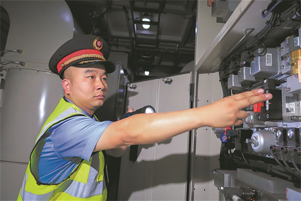 圖為韓二魯在檢查機(jī)車(chē)制動(dòng)柜各塞門(mén)狀態(tài)。周道剛 攝