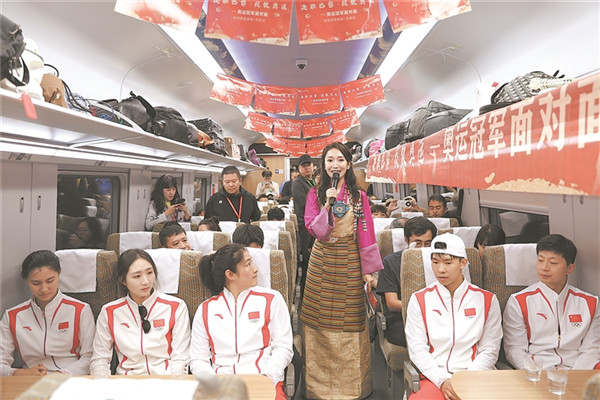 奧運(yùn)冠軍乘坐復(fù)興號(hào)高原動(dòng)車(chē)組列車(chē)。馬生明 攝