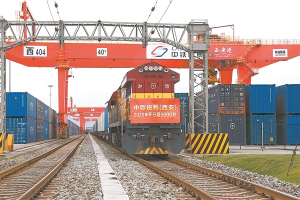今年前10個月,中歐班列(西安)累計開行5063列,首次實現年度前10個月開行量突破5000列大關,創歷年同期最高紀錄。圖為11月17日,一趟滿載光伏組件、跨境電商貨物的中歐班列從西安國際港站發車。孫季翔 攝